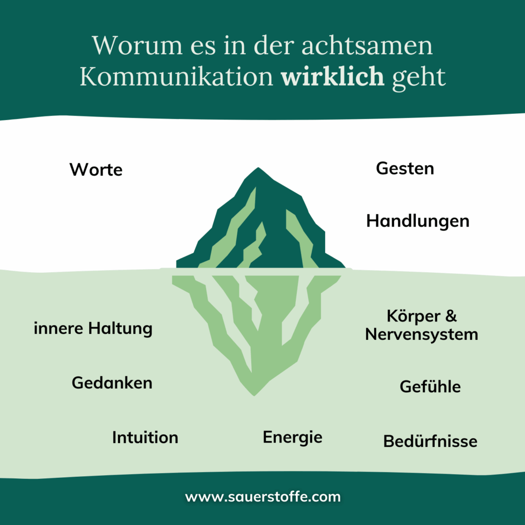 Da sind Gedanken, Gefühle, Bedürfnisse – all das gehört genauso zur Kommunikation wie das, was wir nach außen tragen. Ich stelle mir Kommunikation deshalb gern wie einen Eisberg vor. Oben an der Oberfläche sehen wir Worte, Gesten, Handlungen – doch der viel größere Teil liegt unter Wasser: das, was wir fühlen, was uns bewegt, was wir oft gar nicht direkt mitteilen können. (Auch das Modell der 5 Hüllen aus der Yoga-Tradition beschreibt das hilfreich.)