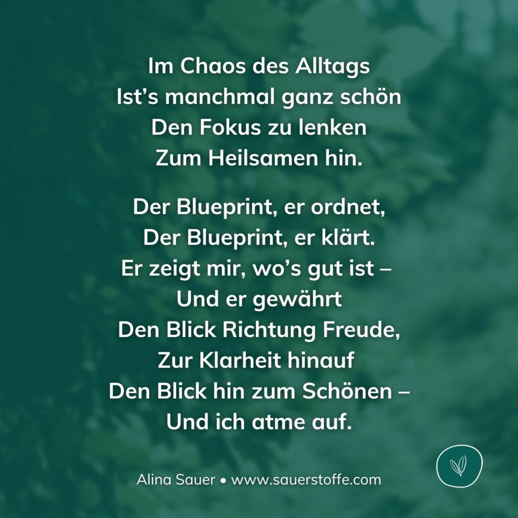 Es kann heilsam sein, den Blick immer wieder einmal im Alltag auf das zu richten, was uns diese Geborgenheit schenkt – auf den Atem, der fließt. Den Boden unter deinen Füßen. Eine Stelle im Körper, die ruhig und entspannt ist. Die Wärme einer Decke, ein vertrautes Geräusch. Diese kleinen Anker sind wie Türen zum Blueprint. Von dort aus kann sich das Ungeordnete neu sortieren. Oder in Reimform formuliert: